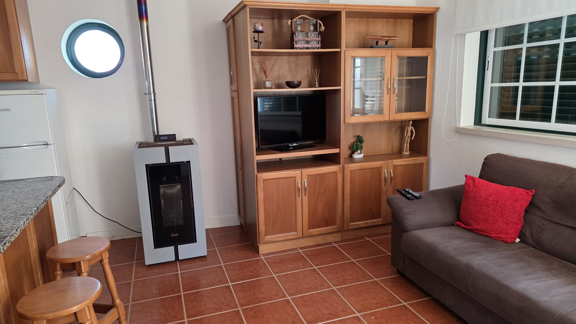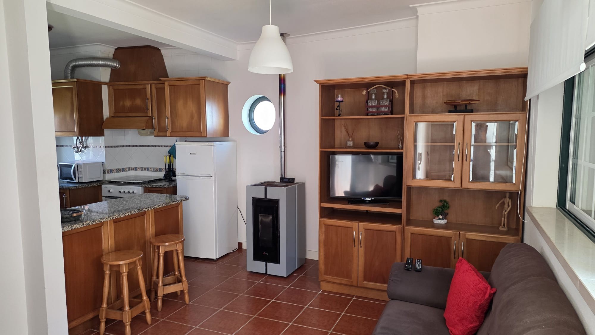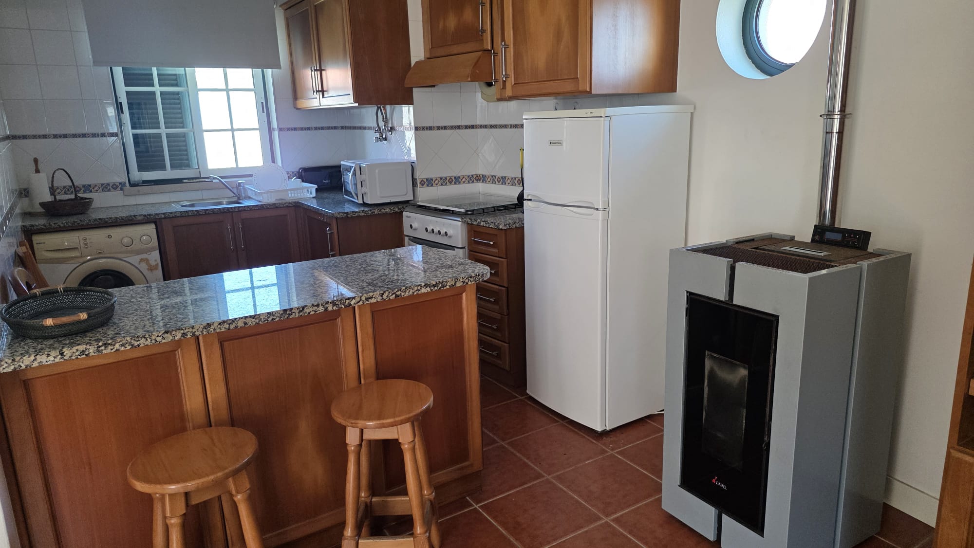 -1 sala e cozinha bastante espaçosas, em Open Space, ambas completamente mobiladas, a cozinha totalmente equipada, com fogão, forno, exaustor, micro-ondas, máquina lavar roupa e frigorífico, a sala por sua vez também mobilada é aquecida por uma salamandra ali existente.
